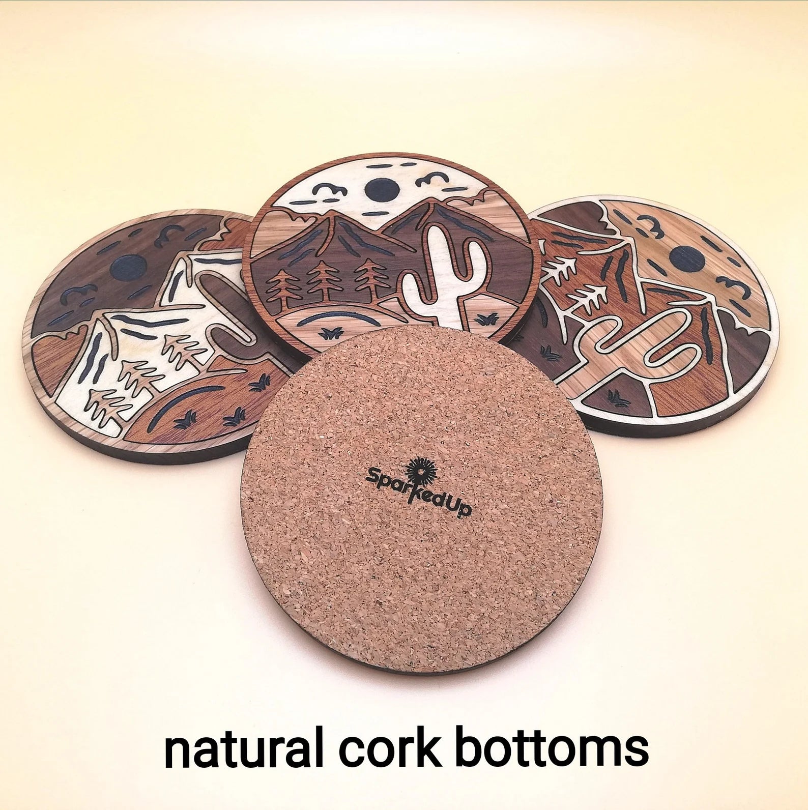 Wood Inlay Coaster Set: Cactus & Mountain